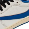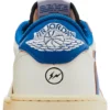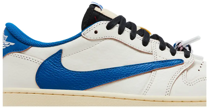 Crafted with a premium leather upper, the sneaker features a clean Sail base accented by bold Military Blue overlays and detailing. The signature reverse Swoosh appears in black, while co-branded logos from Fragment, Cactus Jack, and Jordan add authentic touches throughout, including embroidered heel insignias and custom insoles.